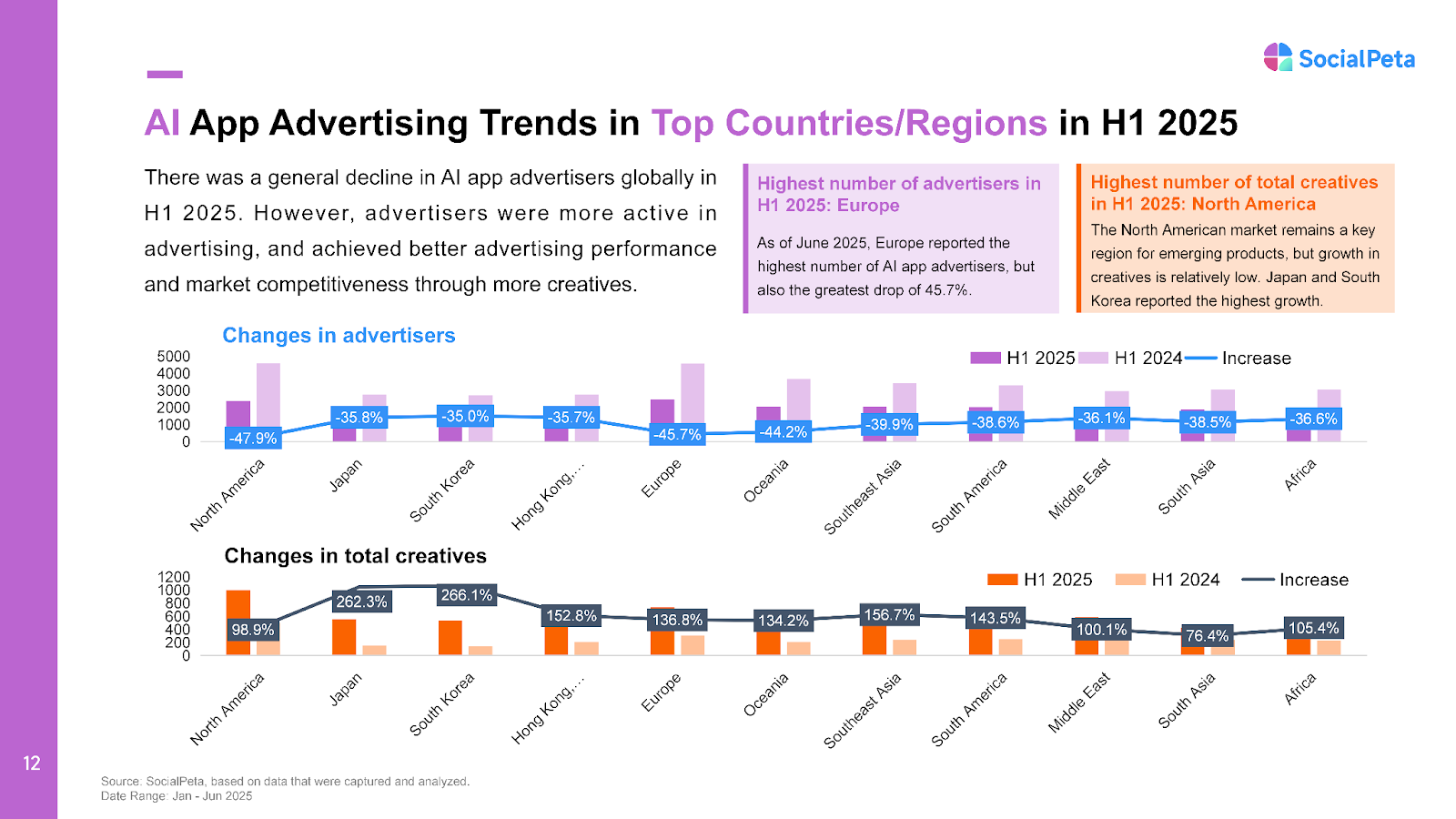 - Japan and South Korea stood out with creative volumes surging 262.3% and 266.1% Y/Y, respectively, positioning them as high-potential growth markets.