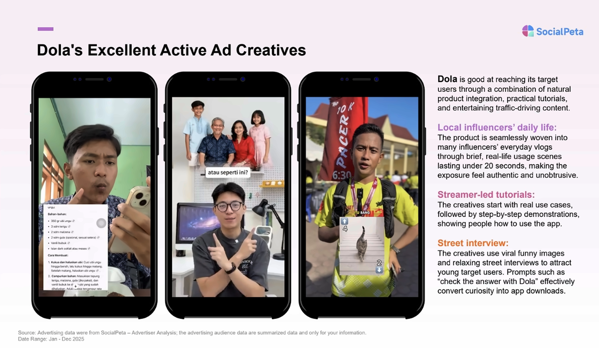 • Dola: Focuses almost exclusively on video ads across multiple networks (Meta, Google, TikTok, AppLovin). Their creatives predominantly feature real-people narratives, where a video is generated based on the person's description.