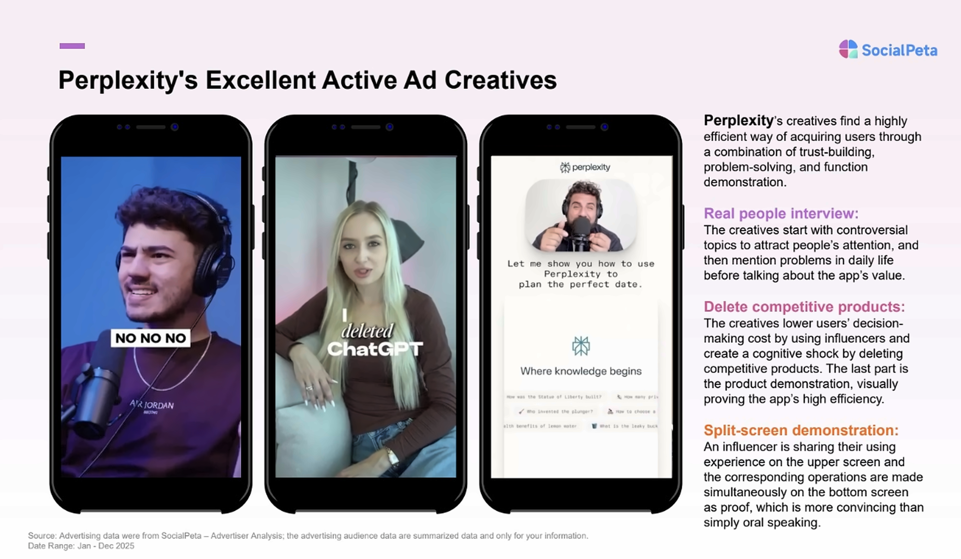 Across the board, certain creative formats consistently outperform others. Real-people interviews and split-screen demonstrations are highly effective, a strategy AI apps have seemingly adopted from successful gaming creatives.